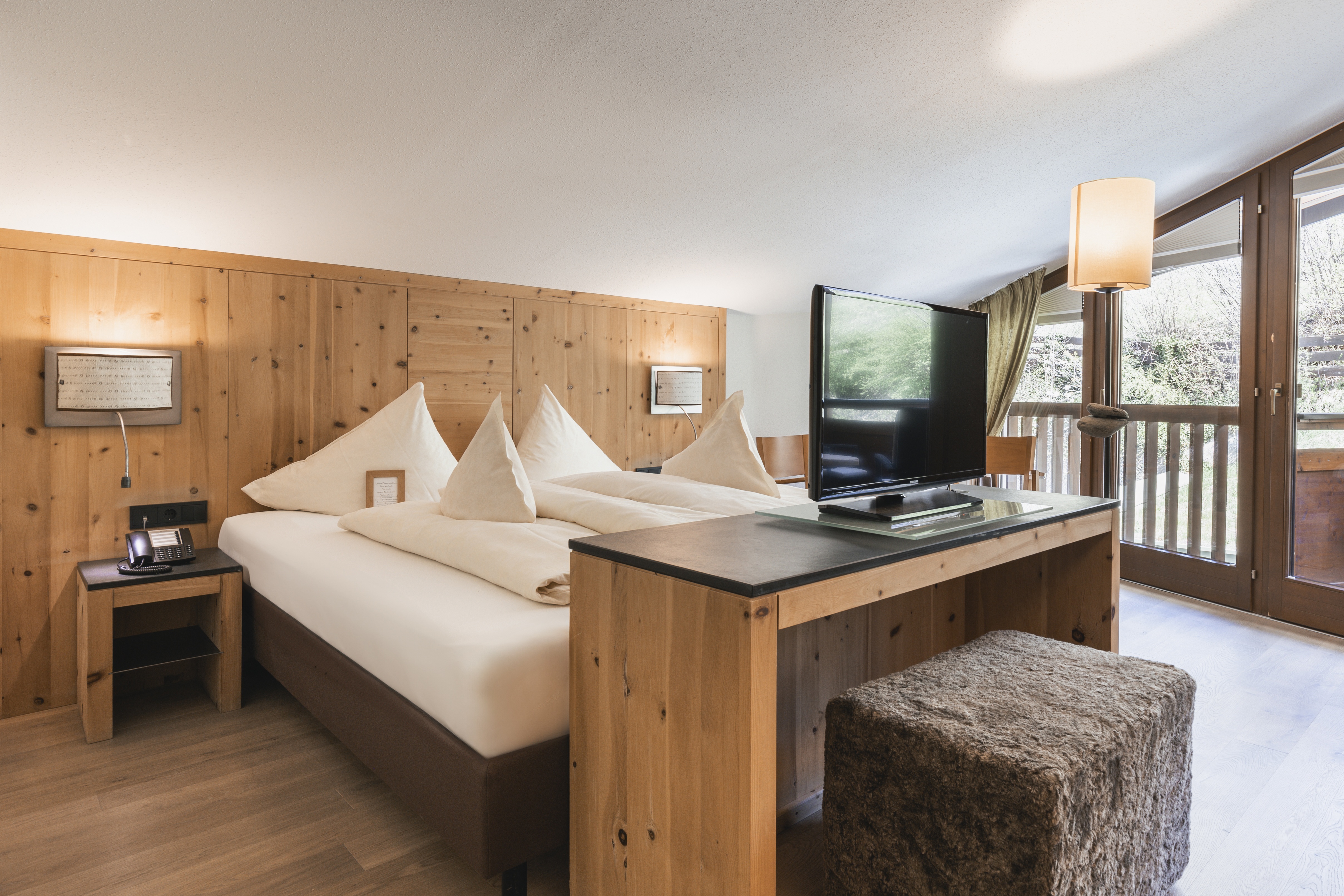 Doppelzimmer in massivem Zirbenholz und Parkettboden (24 bis 31 m²), mit Ostbalkon zur Bergseite (nur Morgensonne)